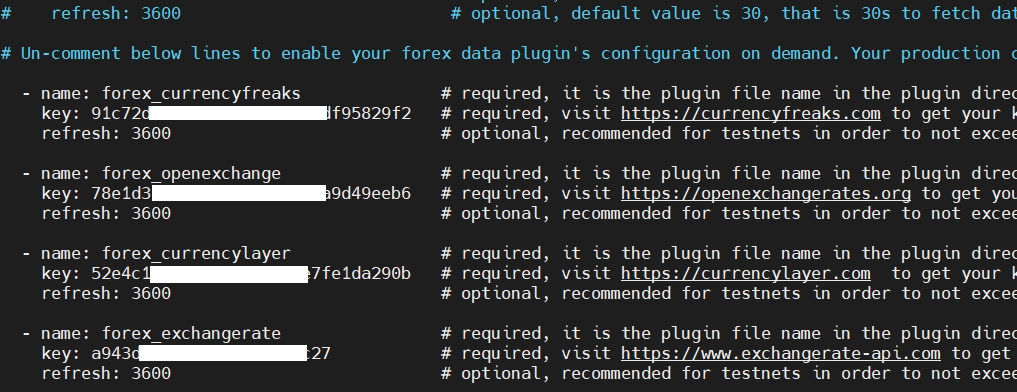 vim $HOME /autonity-oracle/build/bin/plugins-conf.ymlYou plugins-conf.ymlneed to uncomment the bottom lines, register using the links, get the API keys and add them below. Also, be sure to add the refresh request time: 3600 as in the screenshot below, so that the API limits do not quickly burn out